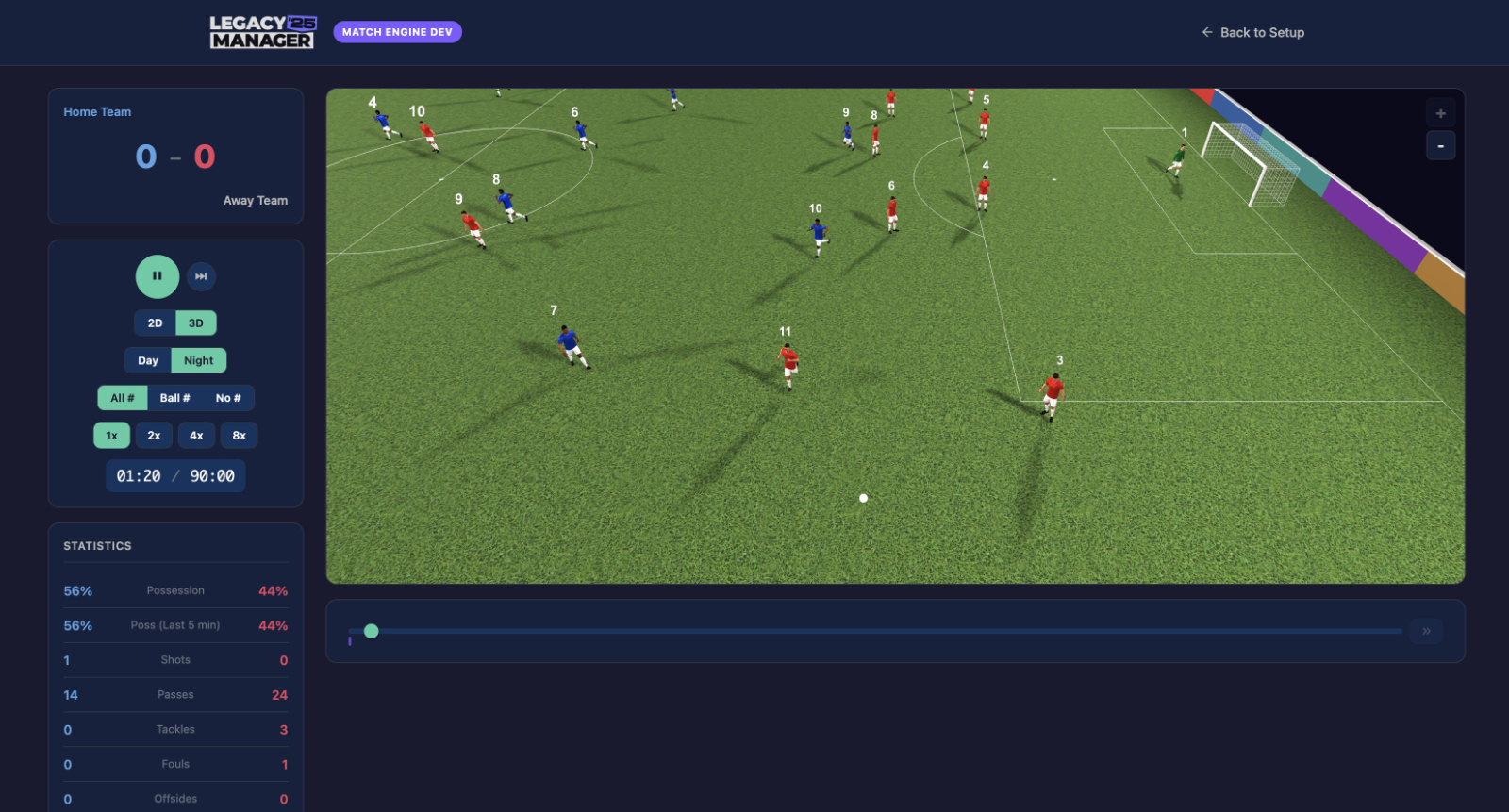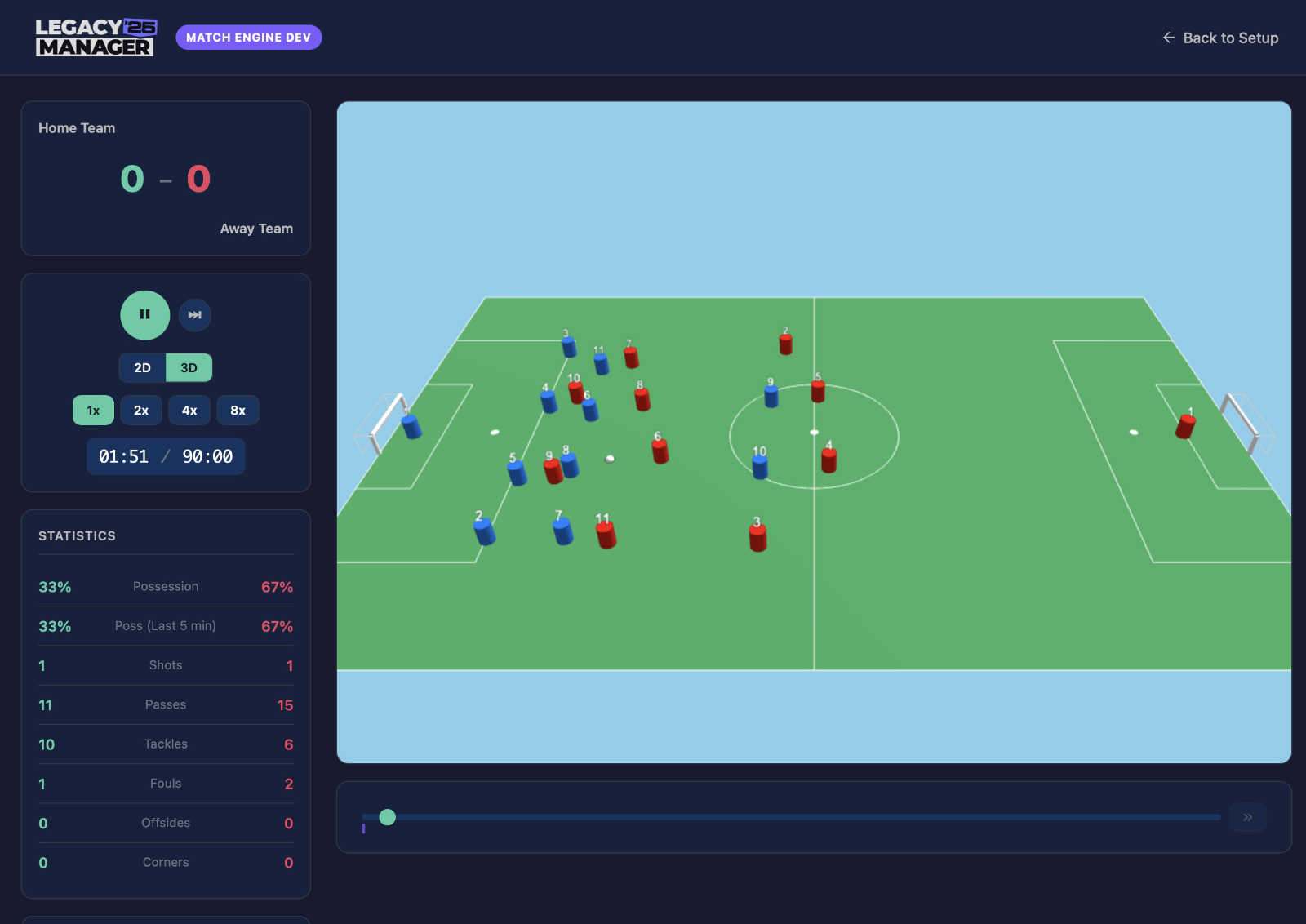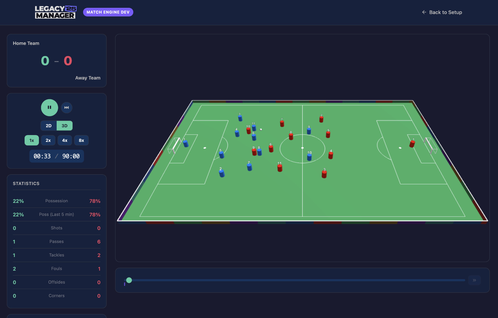 When I started work on the match engine in the early versions of Legacy Manager I contemplated having no match view at all, relying on just an old-school style text display. The early Championship Manager games worked that way, and they were some of the most fun I ever had playing management games.