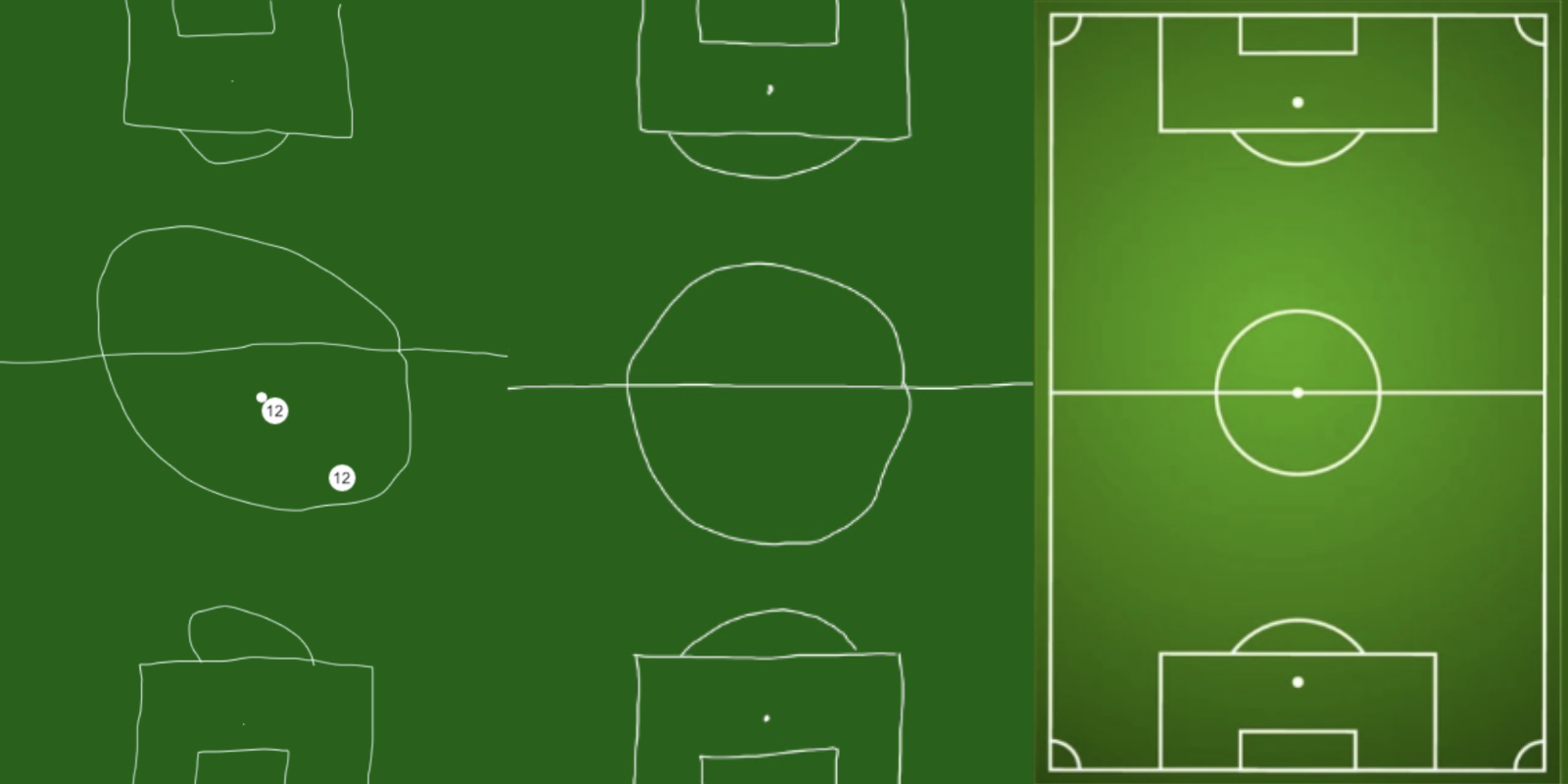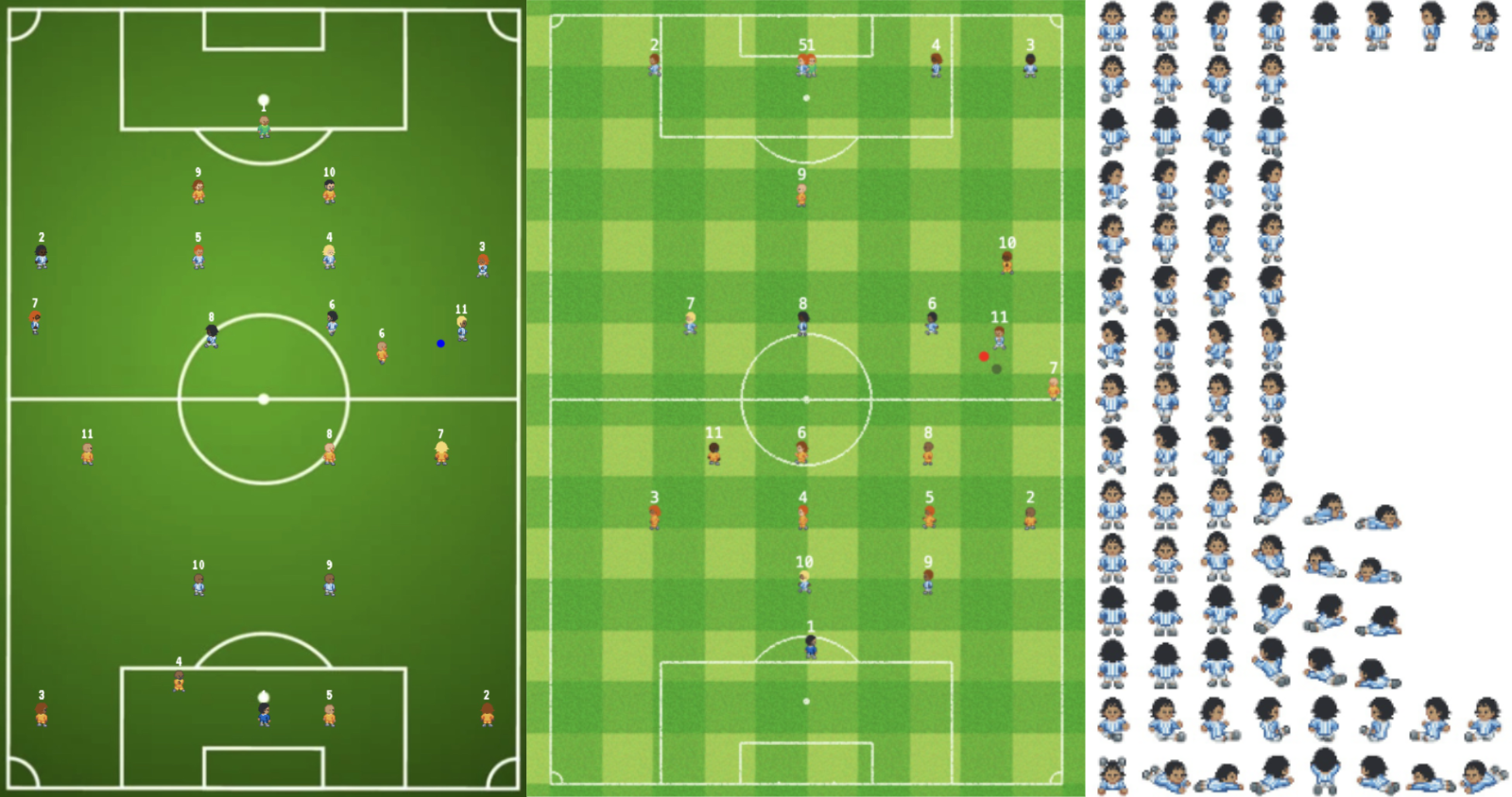 Here you can see the old style pitch with the pixel-art players, the updated pitch to also use a pixel-art style, and on the right the sprite-sheet we designed to cover all of the animations I'd need for each player.